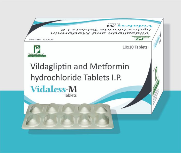Vidaless-M tablets are used to manage type 2 diabetes mellitus by controlling blood sugar levels. The medication works by improving the body’s sensitivity to insulin and reducing sugar production in the liver (metformin) and by stimulating the release of insulin and reducing glucagon secretion from the pancreas (vildagliptin). This combination helps prevent serious diabetes complications like kidney damage, eye damage, and nerve problems
